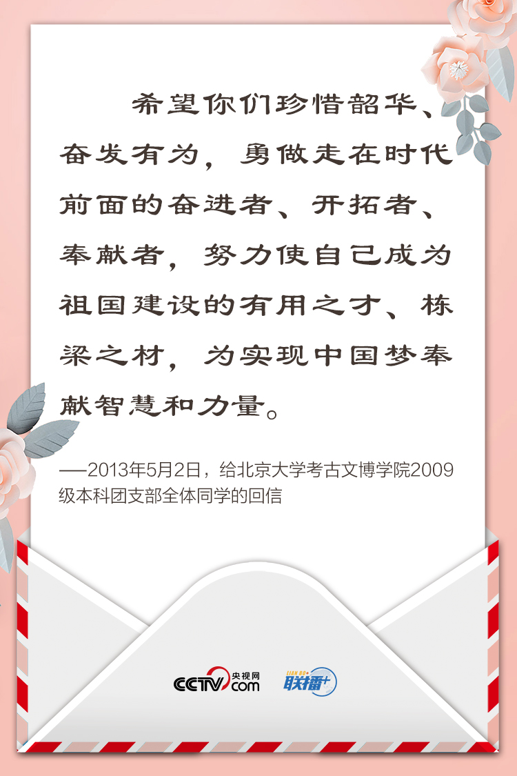 “我國(guó)廣大青年要堅(jiān)定理想信念,培育高尚品格,練就過(guò)硬本領(lǐng),勇于創(chuàng)新創(chuàng)造,矢志艱苦奮斗,同億萬(wàn)人民一道,在矢志奮斗中譜寫新時(shí)代的青春之歌。”