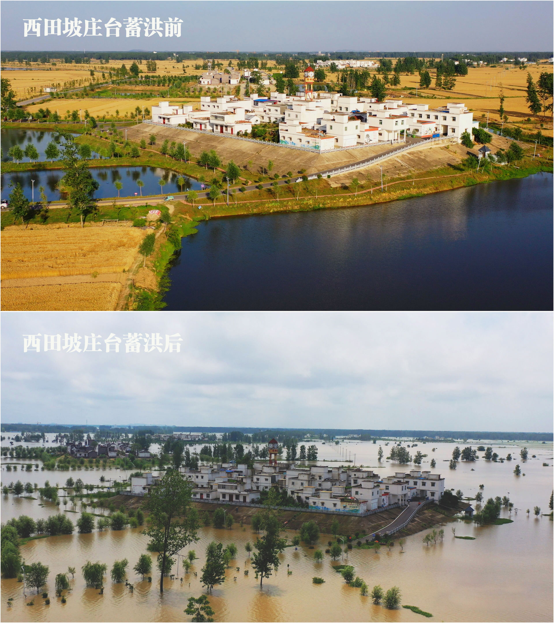 △蓄洪前和蓄洪后的西田坡莊臺(阜南融媒供圖)