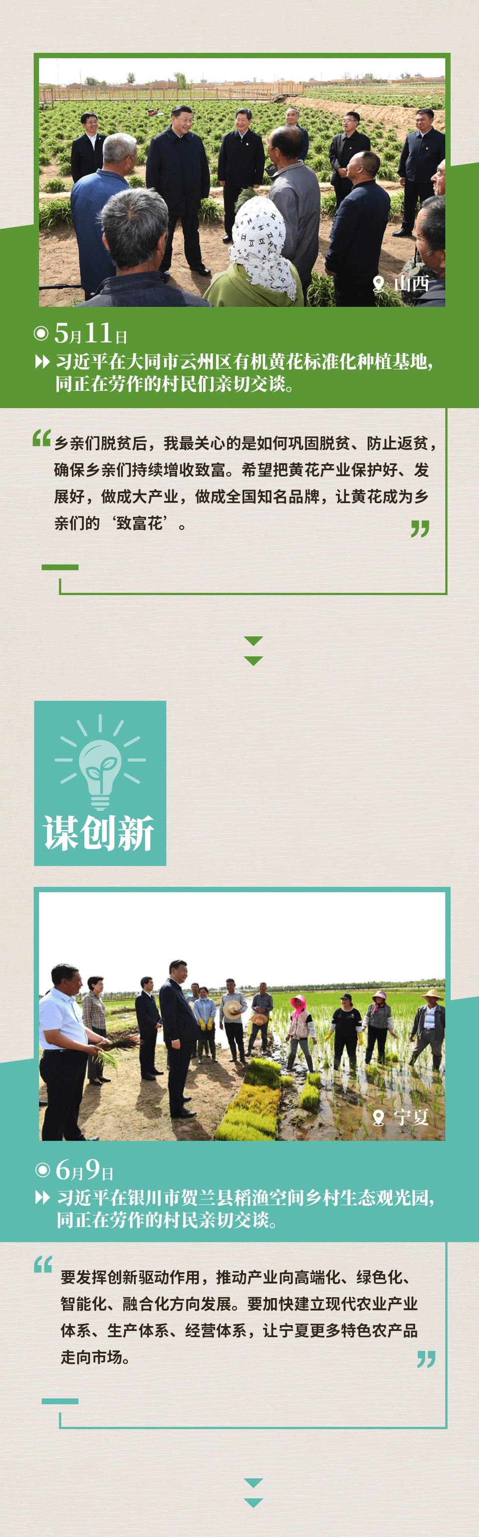 田間地頭,半年來習(xí)近平地方考察的高頻地。浙江余村、陜西蔣家坪村、山西大同市云州區(qū)、寧夏賀蘭縣、吉林梨樹縣……半年來,習(xí)近平一次又一次走進田間地頭。