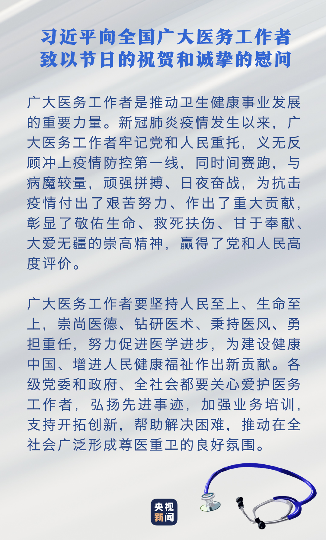 在中國醫(yī)師節(jié)到來之際,習(xí)近平總書記代表黨中央,向全國廣大醫(yī)務(wù)工作者致以節(jié)日的祝賀和誠摯的慰問。