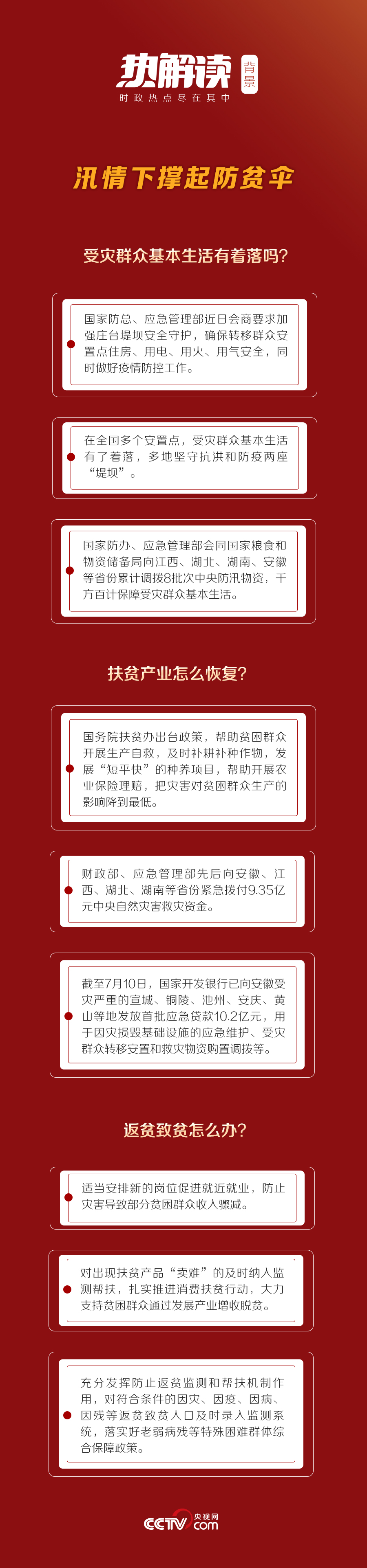 眼下,安徽省正抓緊落實35項政策措施以防止因洪澇災害致貧返貧。多地村干部統(tǒng)計受災家庭情況,倒塌房屋重建,政府戶均補助2萬元;每吸納一位沿淮行蓄洪區(qū)貧困戶就業(yè),阜陽市當?shù)卣o予一次性補貼2000元,上不封頂;六安市157家扶貧車間已經(jīng)全面恢復生產(chǎn)……