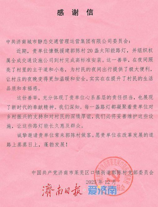 “以前晚上出門總得摸黑,現(xiàn)在走到哪兒都是亮堂堂的,晚上串門、散步方便多了!”如今,夜幕降臨后,一盞盞路燈照亮了村道巷口,不僅方便了村民生活,也為村莊增添了溫暖的夜景,郭陳村村民自發(fā)向濟(jì)南靜態(tài)交通集團(tuán)寫了感謝信。