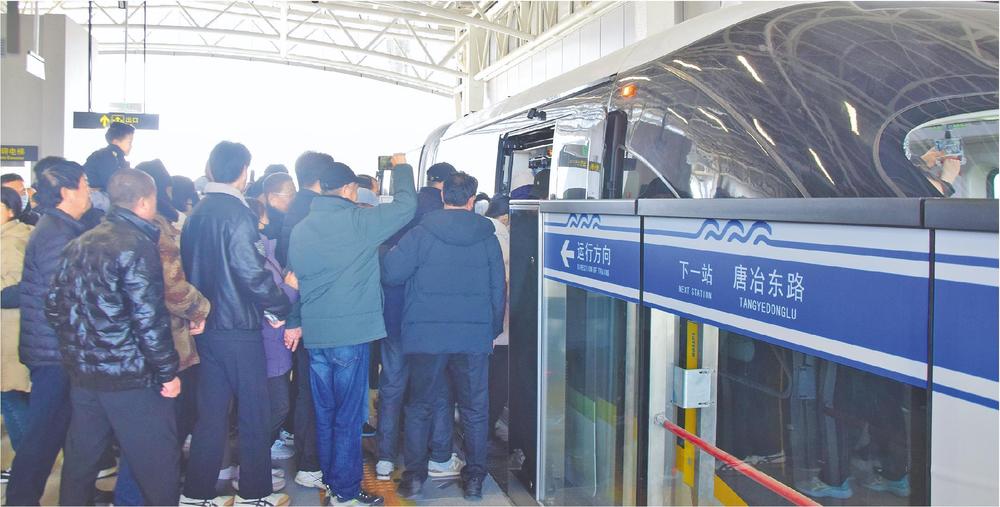 由于彭家莊站是云巴與地鐵2號(hào)線的換乘站,市民在此排起了隊(duì)。記者跟車體驗(yàn),由于云巴沒(méi)有紅綠燈限制,速度相較于地面上的私家車和公交車要稍微快一些。每站運(yùn)行加上?康臅r(shí)間大約2分鐘,全線32座車站整體運(yùn)行時(shí)間約一個(gè)小時(shí)。