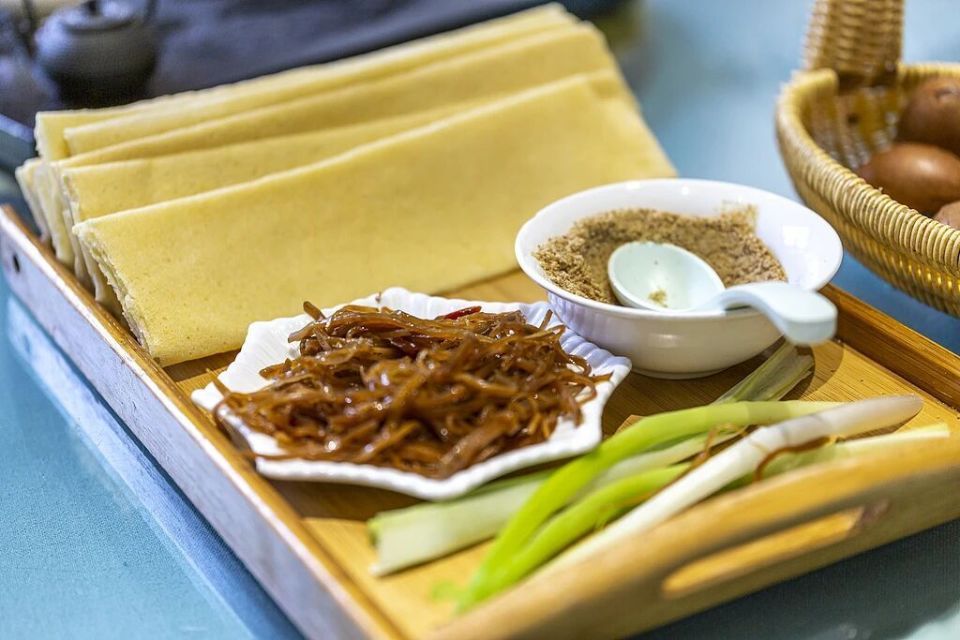 沿路可體驗小吃攤的泰山煎餅卷大蔥,薄脆餅皮裹著鮮香醬料與蔥段,解乏又開胃。