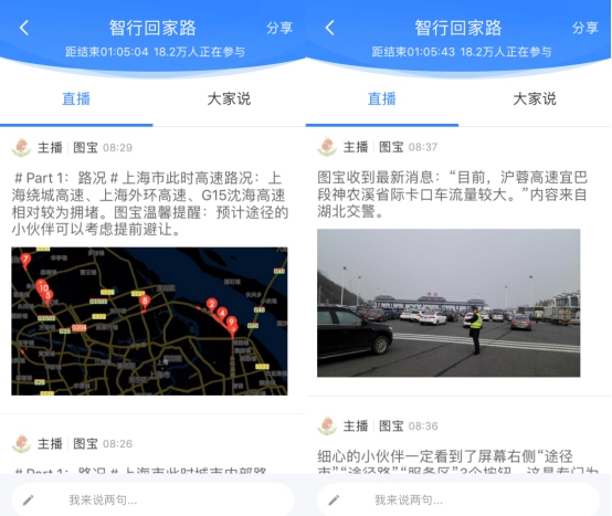 為幫助廣大用戶順利踏上返鄉(xiāng)路,百度地圖于1月21日早上8點(diǎn)及時(shí)上線了“智行回家路”直播間,提供包括全國城市路況、高速路況、人流遷徙、熱力圖、熱門自駕路線等全方位交通及安全信息。截止到13時(shí)直播結(jié)束,短短5個(gè)小時(shí)內(nèi),直播間發(fā)布全國各地重要出行信息上百條,共有18.7萬人涌入直播間查看相關(guān)信息,引發(fā)用戶討論近2000條。